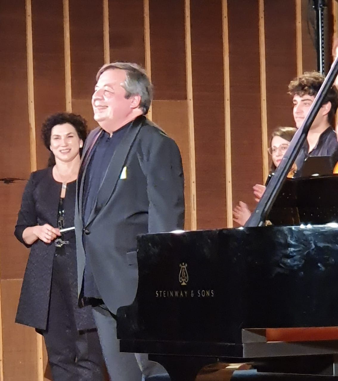 Eröffnungskonzert zum 10jährigen Jubiläum des ukrainischen Exilfestivals Odessa Classics im Sendesaal in Bremen mit seinem Gründer und Direktor Alexey Botvinov (Klavier), Myroslava Kotorovych (Violine) und dem jungen ukrainischen Ensemble arteHatta unter der Leitung von Oksana Madarash.