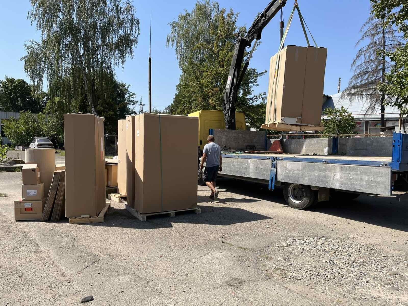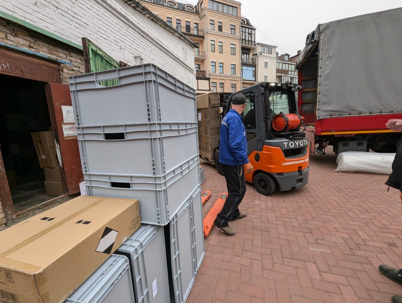 Transport von Berlin nach Lwiw: 3D-Scanner für die Initiative "SaveUkrainianHeritage" von SKEIRON zur Digitalisierung der Architekturdenkmälder, Monumente und Museumssammlungen (https://skeiron.com.ua/en/saveukrainianheritage/), Klimakontrollgeräte (Luftbefeuchter und Luftentfeuchter, Hygrometer), 17 Paletten Feuerlöscher (gespendet von Johnson Controls), Feuermeldeanlage zum Schutz von Holzkirchen (organisiert von Blue Shield), Restaurierpapier, Verpackungsmaterial. Mit Unterstützung von OSZE.